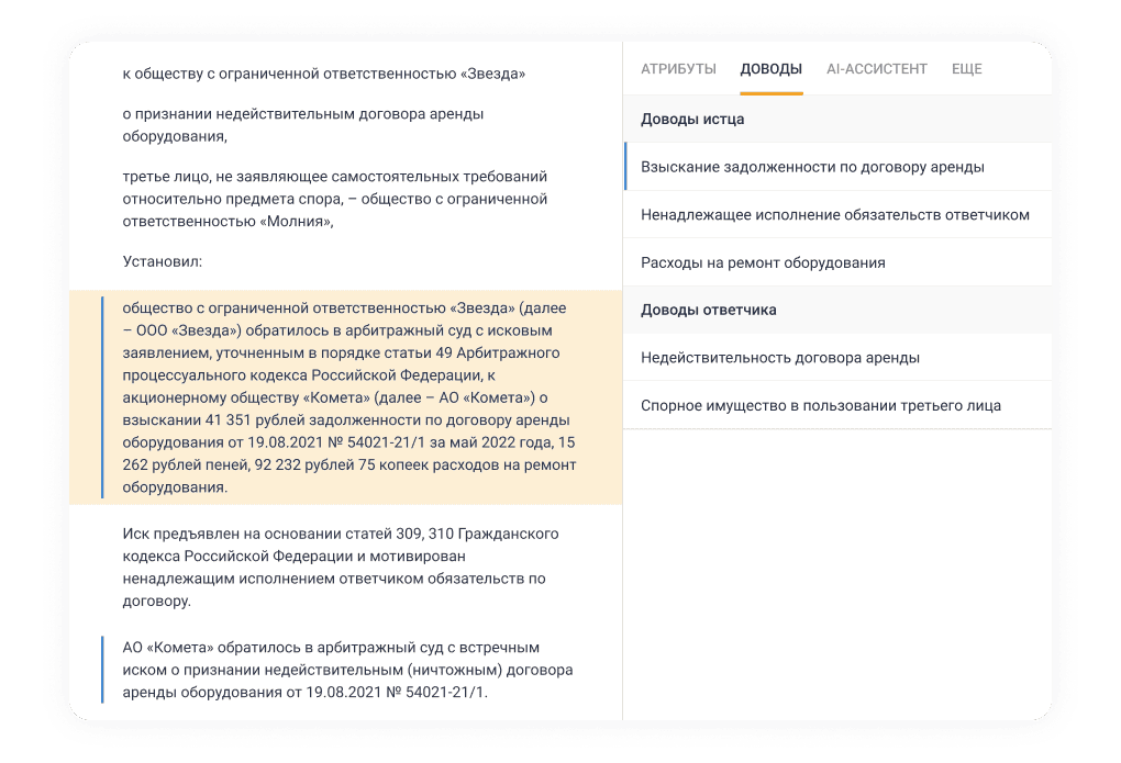 Думайте о судебной стратегии: сервис возьмет на себя поиск практики под вашу ситуацию и анализ доводов сторон в аналогичных спорах.