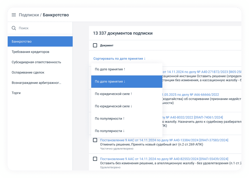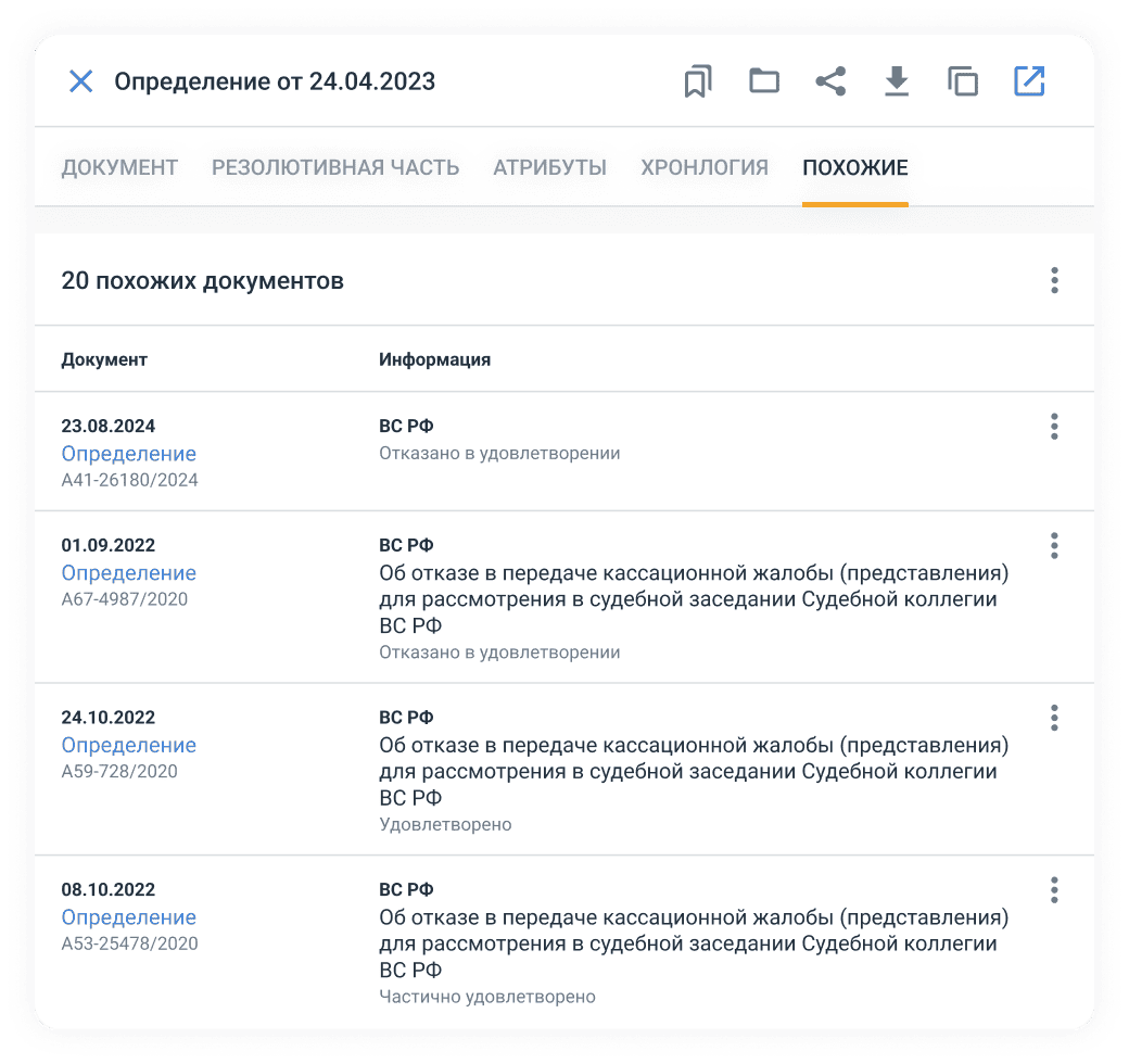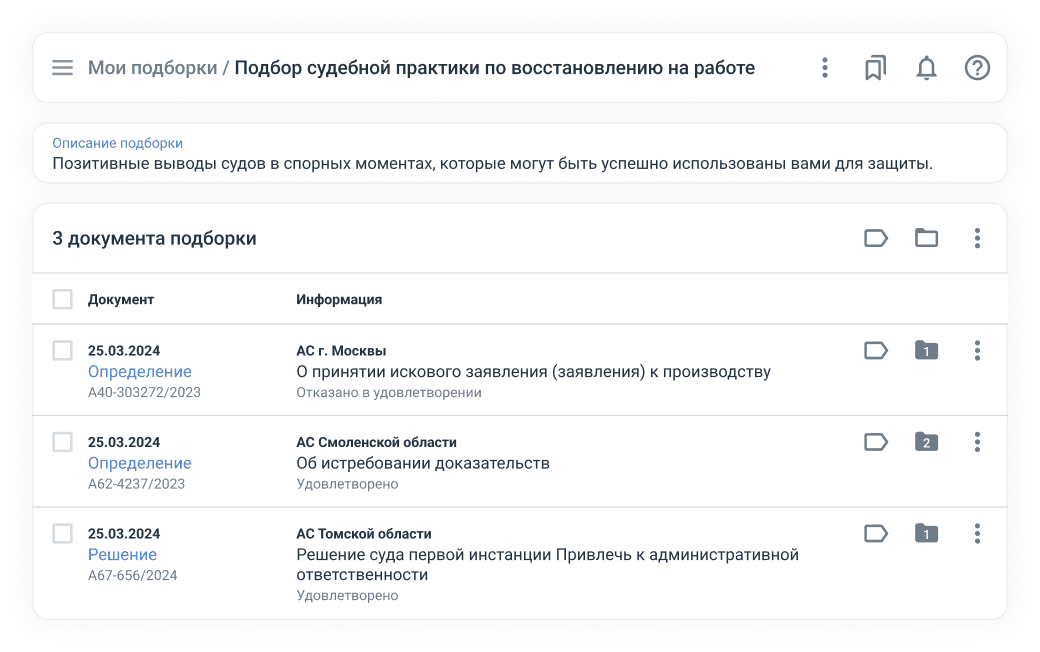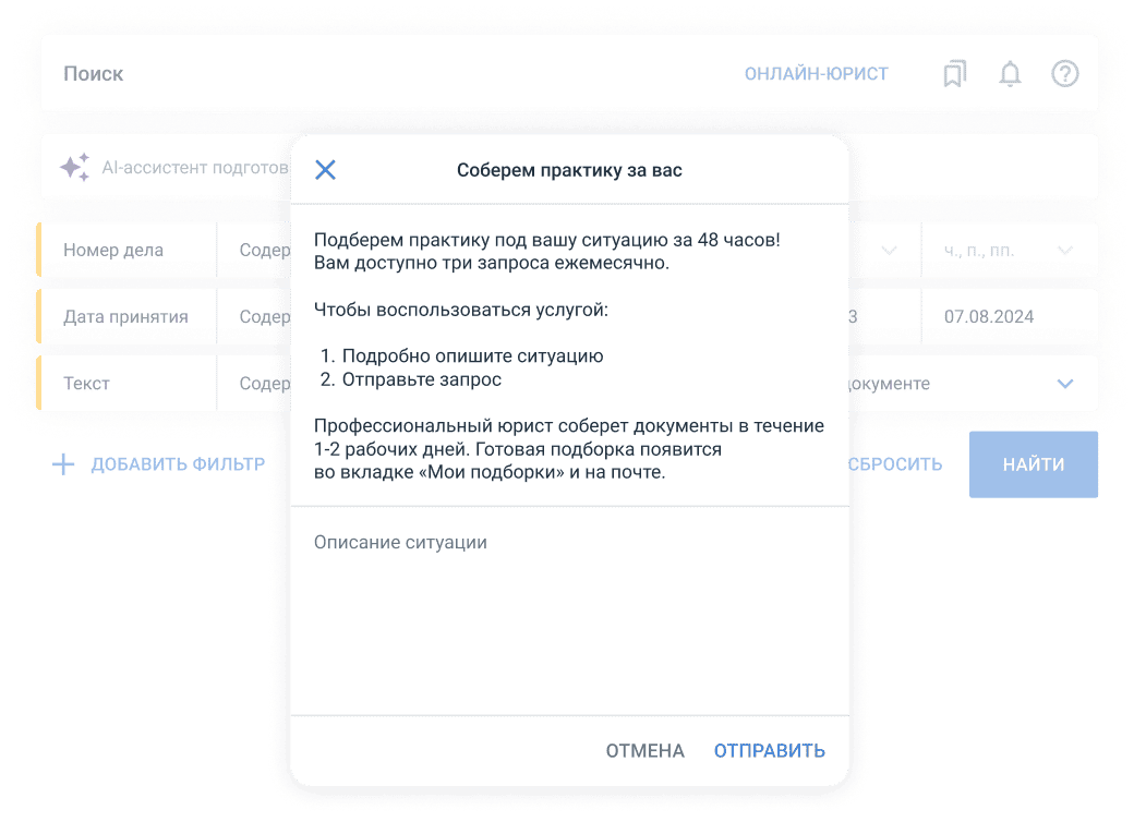 Экономьте время на поиске и анализе судебной практики — получайте всю информацию в одном интерфейсе.