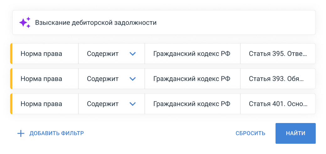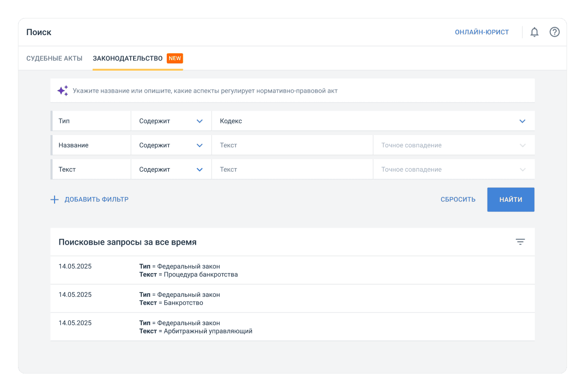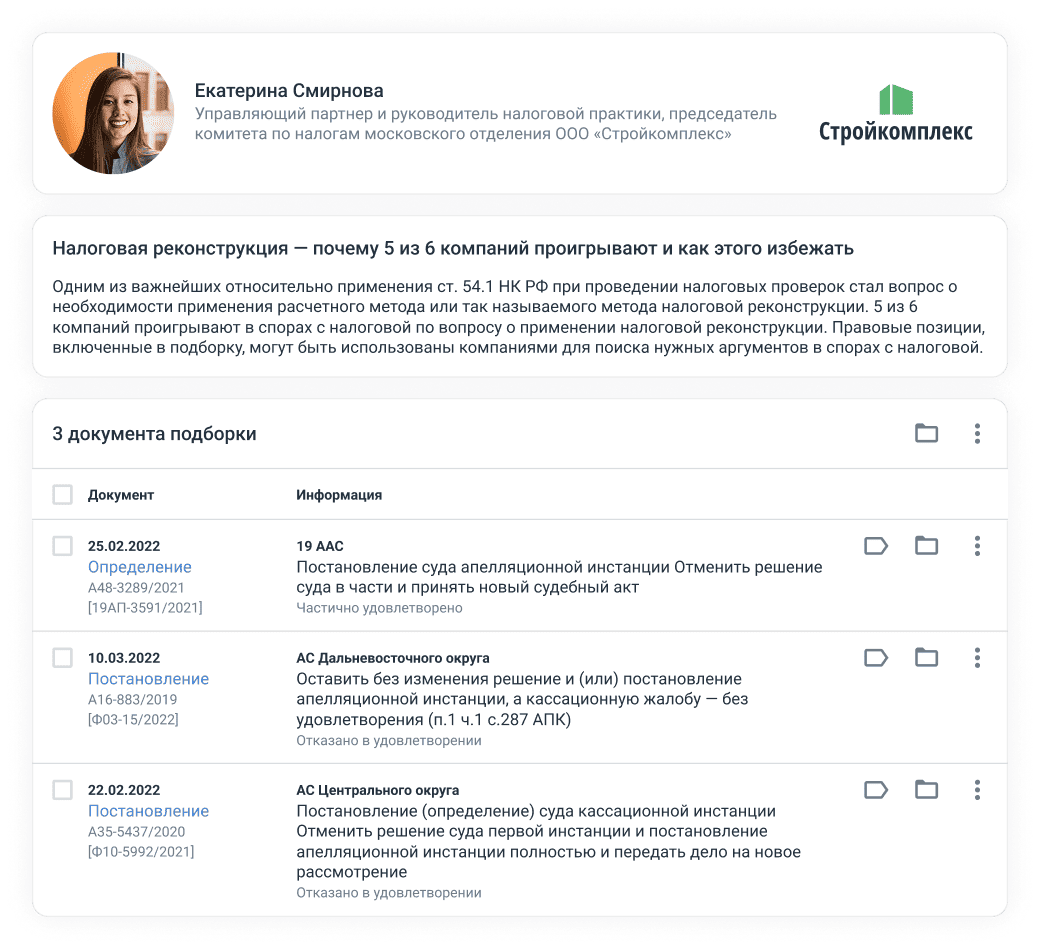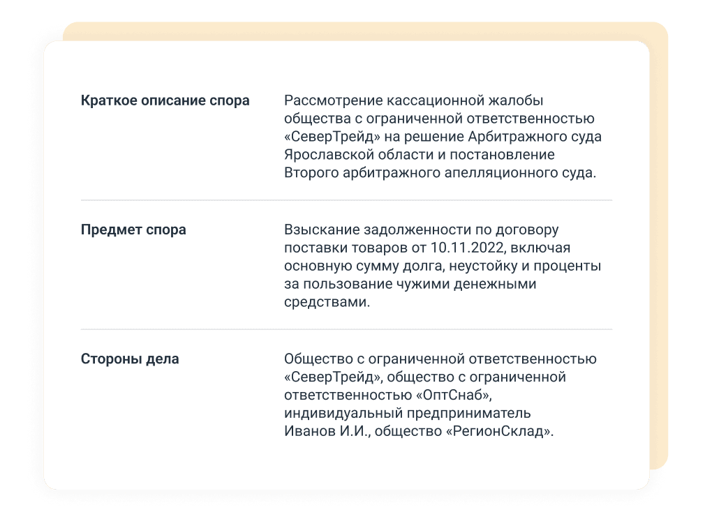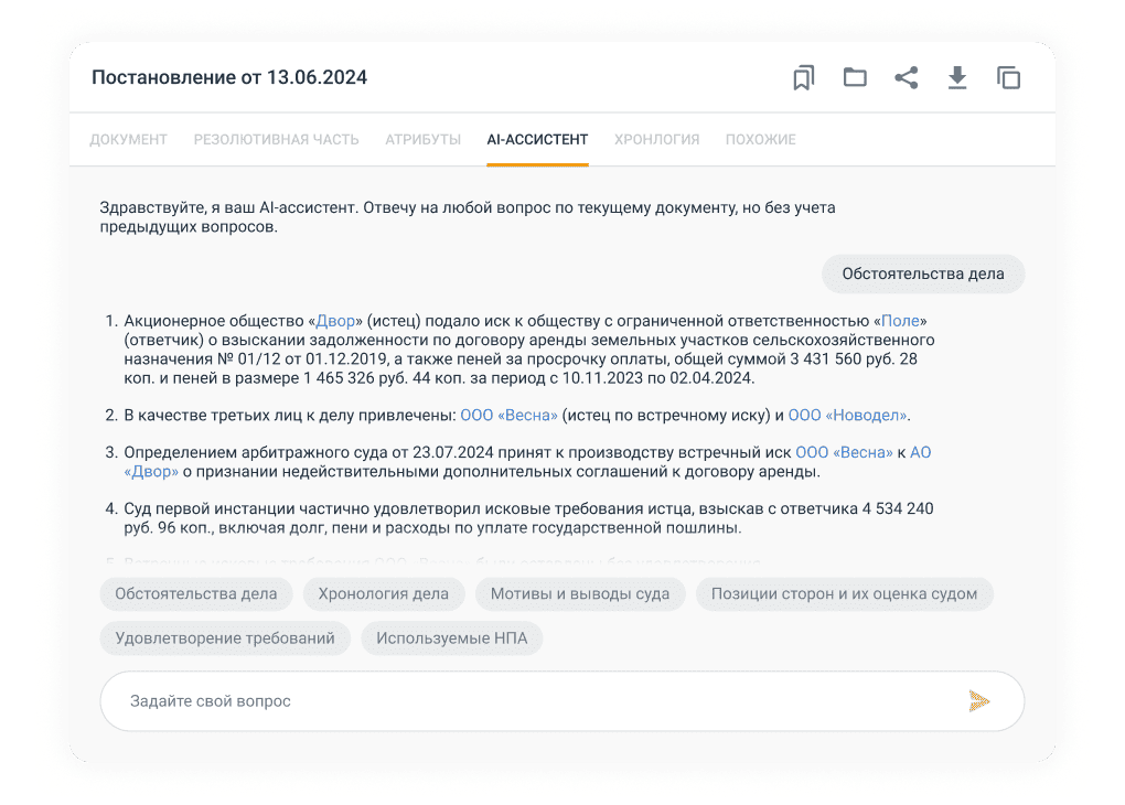 Экономьте время на поиске и анализе судебной практики — получайте всю информацию в одном интерфейсе.