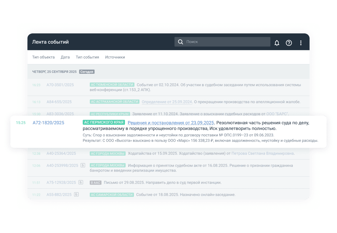 Узнавайте об изменениях в персональной ленте событий и получайте уведомления на почту: назначение, перенос, отложение заседания, вынесение решения, подача жалобы — вы первым узнаете о новом событии.