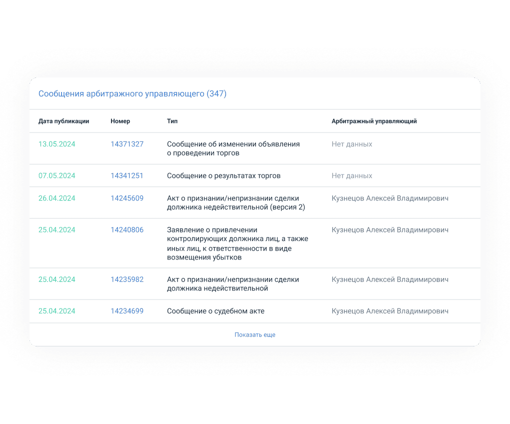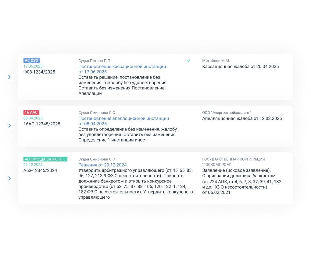 Оцените перспективы дела за секунды и легко ориентируйтесь в информации по спору. Сервис структурирует хаос банкротного процесса: вы видите статус процедуры, хронологию и сообщения управляющего в одной системе.