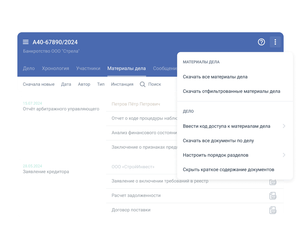 Полная картина банкротства в одном окне — от стадии до материалов дела