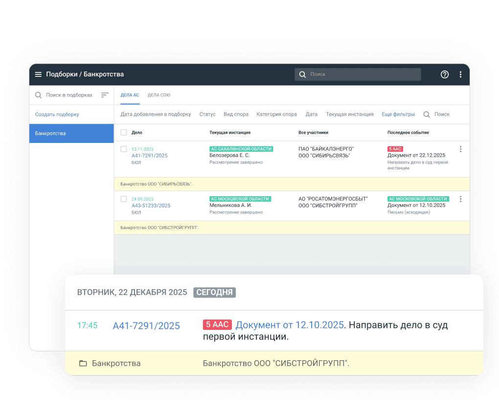 Добавляйте дела в папки-подборки, чтобы быть в курсе новых событий и быстро находить нужную информацию по судебному спору. Система будет автоматически отслеживать все изменения по делам из подборок.